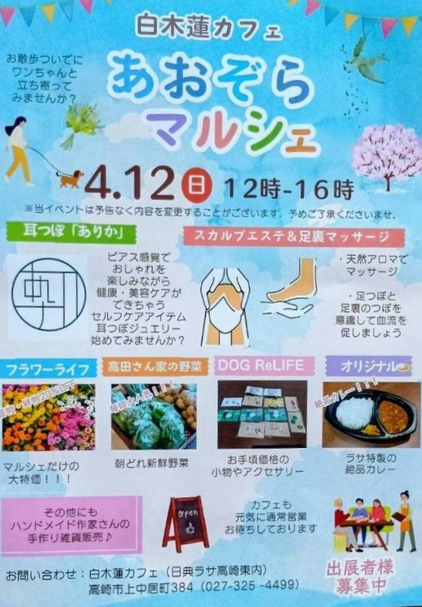 日典ラサ内の「白木蓮カフェ」で開催の”あおぞらマルシェ”に参加します☆ぜひ遊びに来てください(^^♪ 採れたて新鮮お野菜の販売や、カフェの営業もあって毎回地元の方で大人気のマルシェ♪リライフでは、日用品や小物の販売、可愛 […]